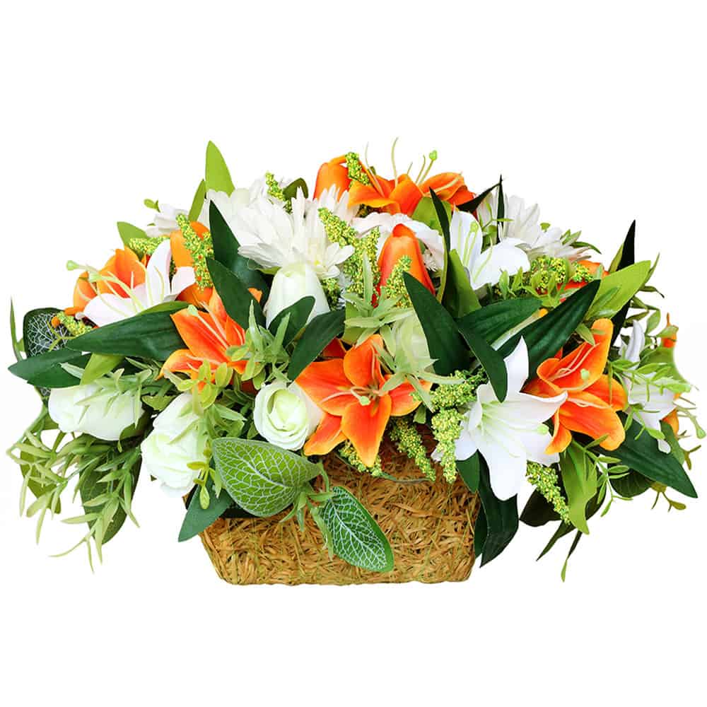 Tonacja: białe i pomarańczowe kwiaty z zielonym przybraniem w donicy.