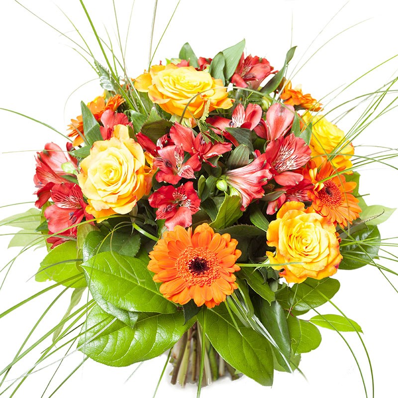 Skład bukietu: róże, gerbery, alstromerie, zieleń dekoracyjna.