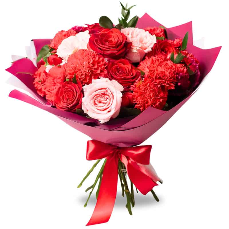 Bukiet “Miłosny Szept” to urokliwa kompozycja czerwonych róż i jasnoróżowych goździków, delikatnie ozdobiona zielenią dekoracyjną. Całość wykończona różową kryzą z papieru i elegancką wstążką, tworzy subtelne i romantyczne połączenie. Idealny, by wyrazić najgłębsze uczucia i zachwycić swoją wyjątkową osobę.