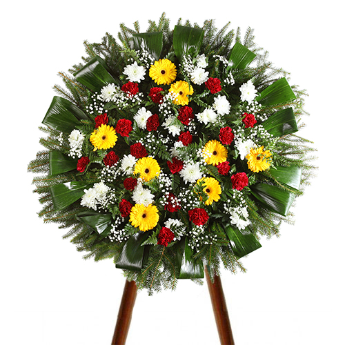 Skład wieńca: gerbery, goździki, margaretki, gipsówka, liście, jodła.